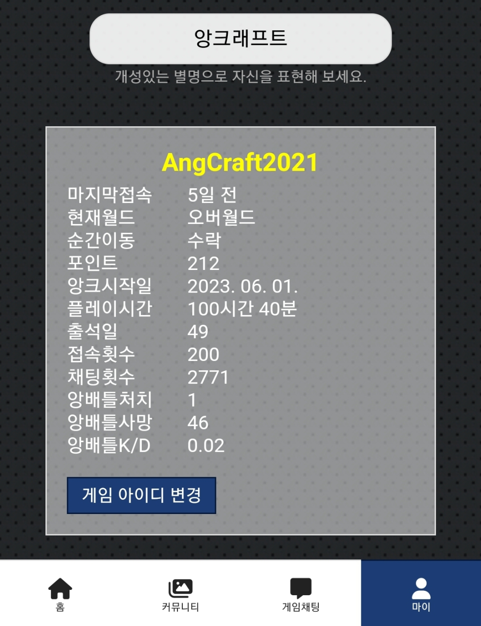 마지막접속 4일 전 현재월드 오버월드 순간이동 수락 포인트 1406 앙크시작일 2023. 06. 01. 플레이시간 425시간 25분 출석일 103 접속횟수 969 채팅횟수 29039 앙배틀처치 110 앙배틀사망 68 앙배틀K/D 1.62