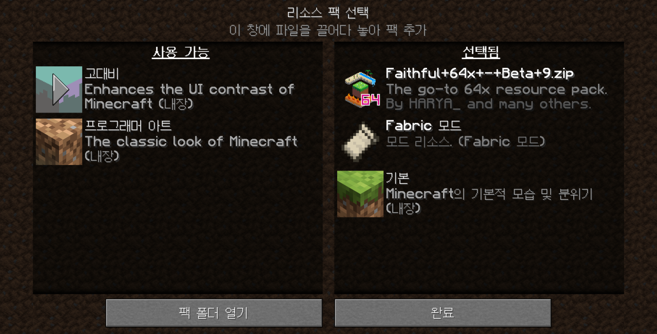 1. 아래 링크에서 리소스팩 다운로드 한다. Faithful 리소스팩 다운로드 2. 게임 설정 > 리소스팩 들어간다. 3. "리소스팩 폴더 열기
