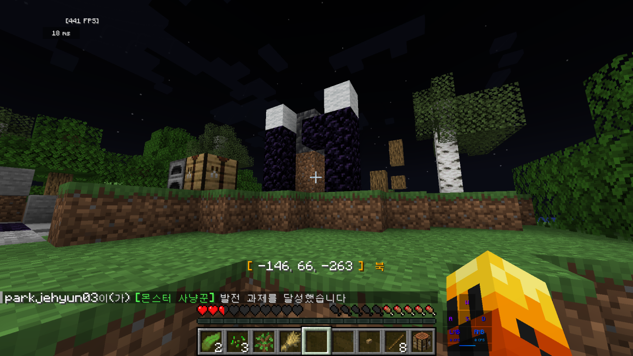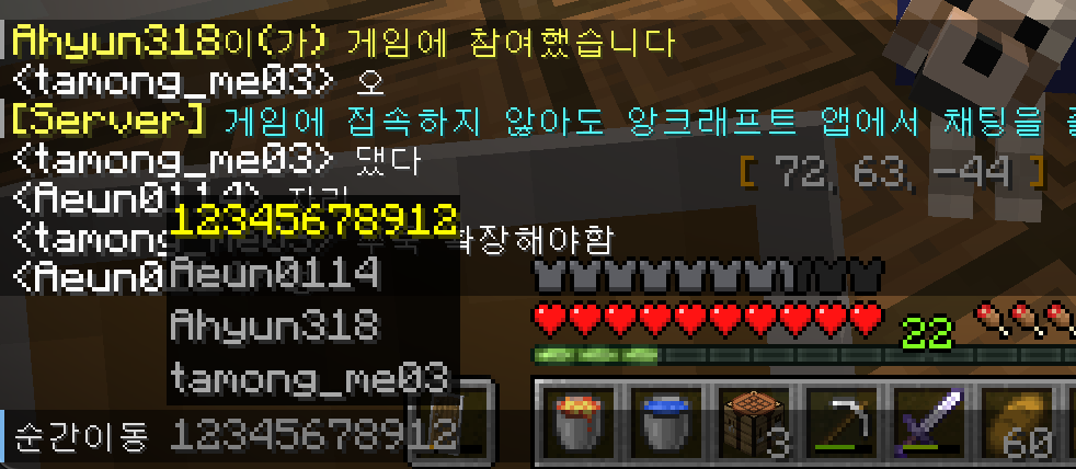 명령어 기능 쓸 때, 특히 순간이동 명령어 사용할 때 다른 사람의 아이디를 입력해야 하잖아요. 영어로 다 칠려면 힘드니까 쉽게 쓰는 방법을 알려줄게요. 마인크래프트 채팅창에 순간이동을 입력한다음에 키보드의 Tab키(탭)를 입력하면 현재 접속되어있는 유저의 아이디가 모두 나와요. 다시 Tab키(탭)를 눌러 원하는 유저를 선택하거나, 아니면 키보드 화살표 방향키로 선택을 할 수 있어요. 이제 명령어 편하게 사용해 보세요^^ 마지막으로 방금 사용했던 채팅을 그대로 입력하기 위해선 채팅창 입력을 열고 키보드의 화살표 방향키 아래, 위를 눌