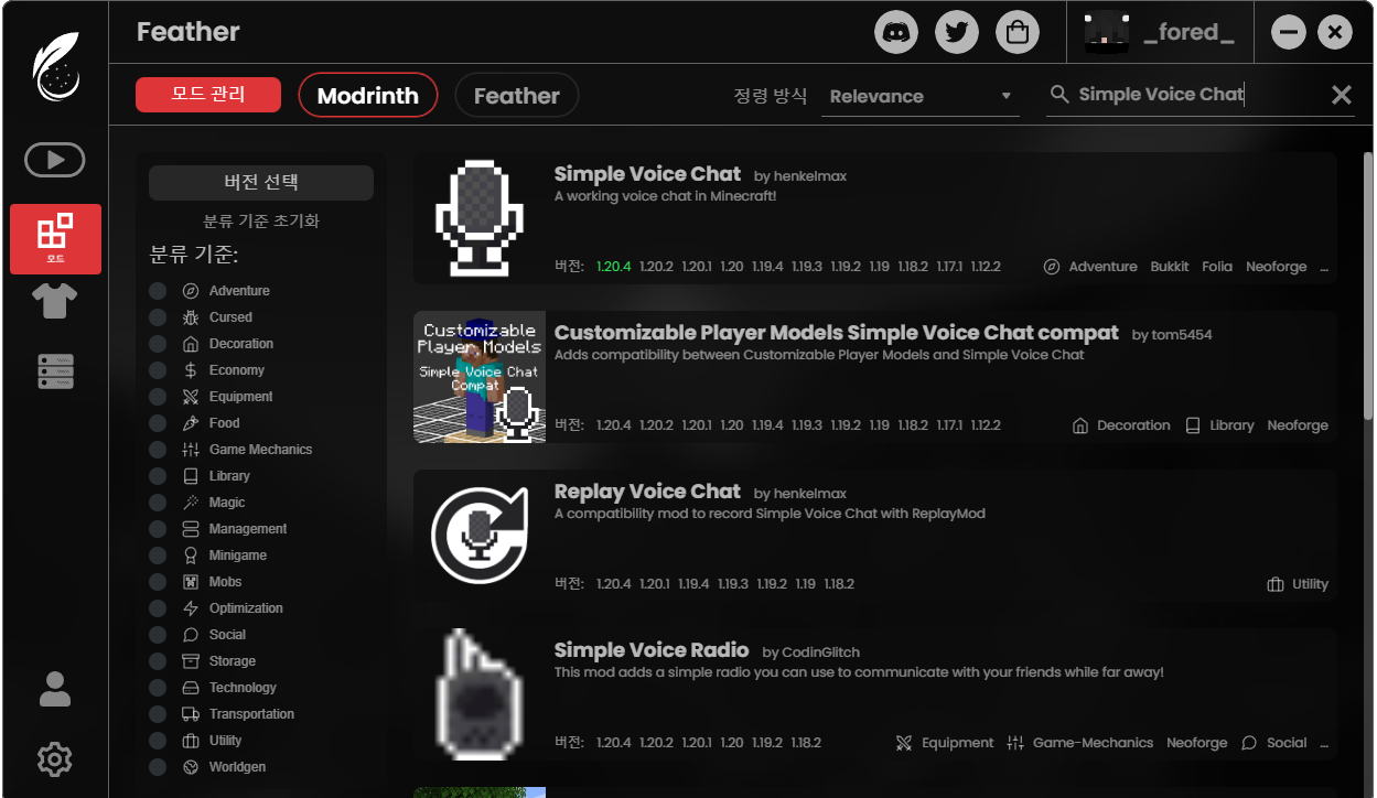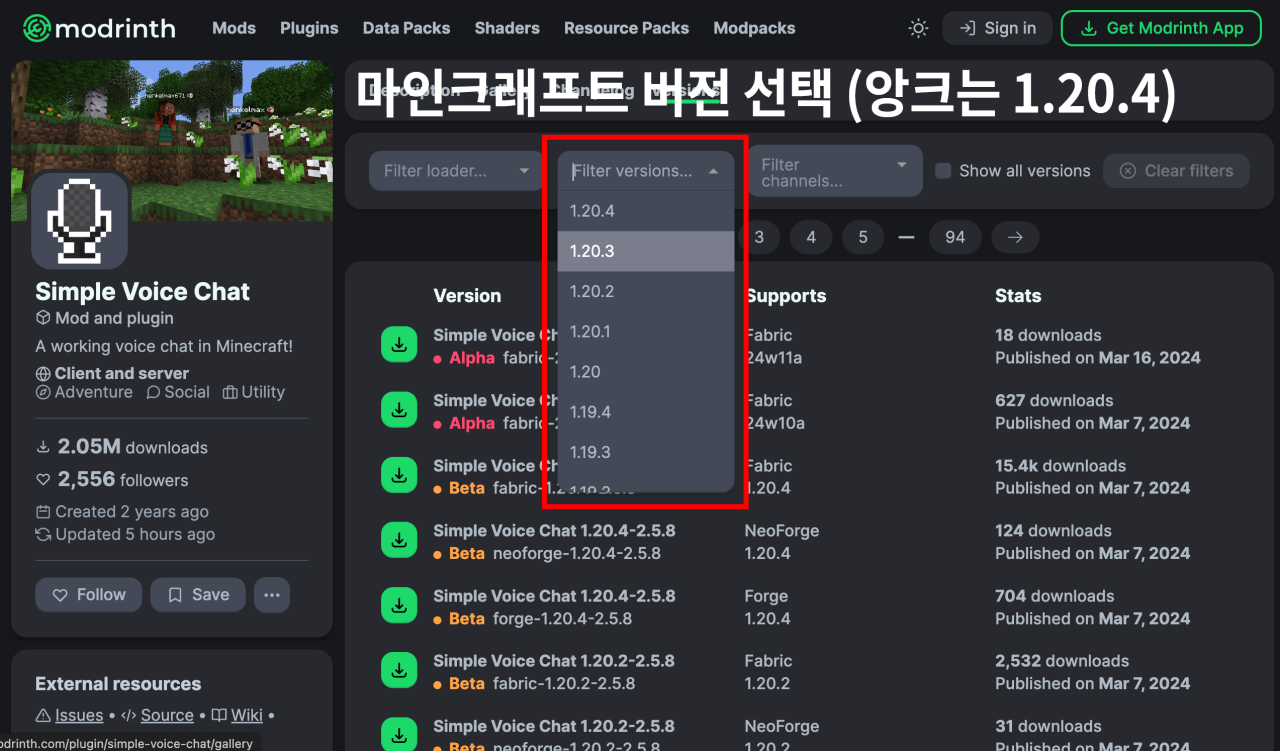 멤버십 서버에 Simple Voice Chat 플러그인 설치함. 음성 채팅하려면 각자 런처에 맞는 모드를 설치하고 접속하면 됨. 모드 다운로드는 아래 사이트 https://modrinth.com/plugin/simple-voice-chat/versions 1. 자신의 런처에 맞는 버전 선택 2. 마크 버전 선택 3. 최신버전 다운로드 4. 모드 적용
